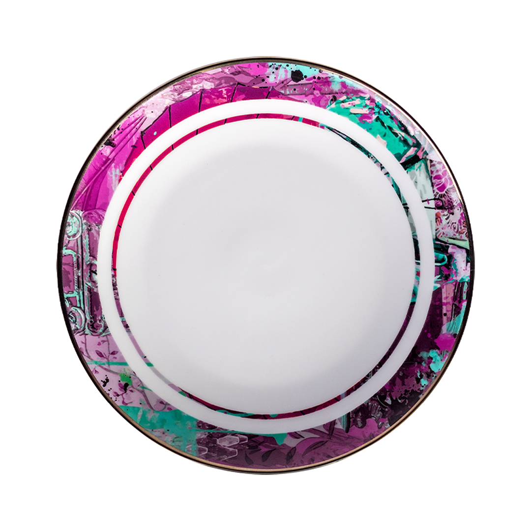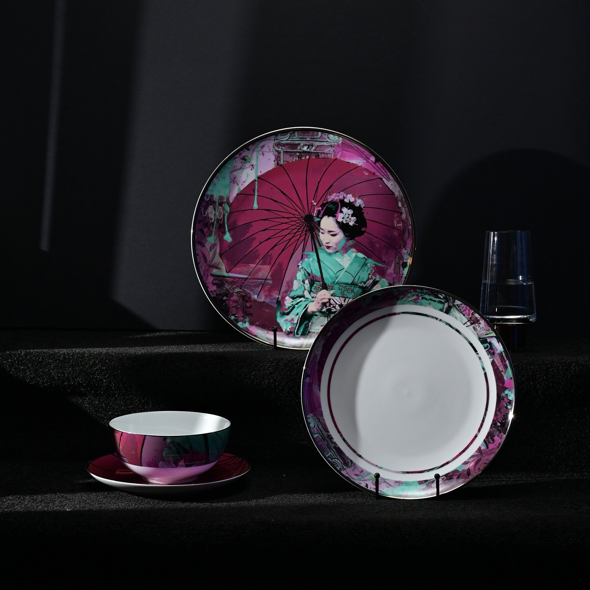 Bold and audacious yet exudes impeccable elegance; this collection aspires to take you to the mesmerizing location and exotic lands of the orient. Zuluaga’s unique style of brilliant symbolism and idiosyncratic coalescence display elements of fantasy and dream-like poetic imagery. Geishas are a symbolic representation of Japanese culture and mythical beauty and intrigue. Our majestic royal amethyst series will add a splash of magical realism to your dining experience.