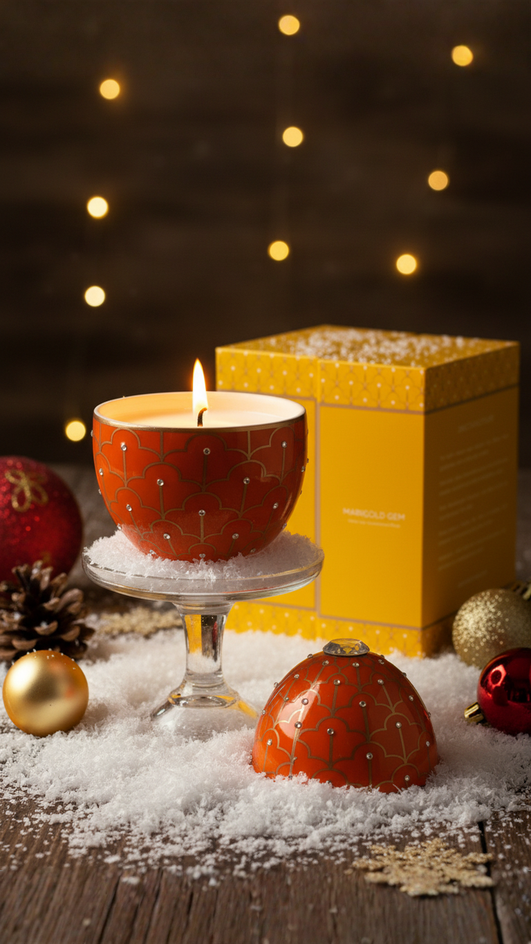 Indulge in sophistication with this exquisite decorative candle, housed in a vibrant marigold vessel adorned with delicate gold patterns.